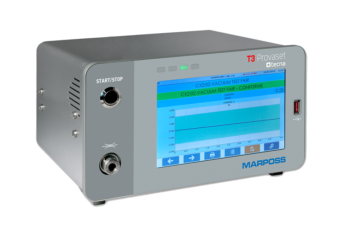 The T3LPQ is a high resolution flow testing instrument designed to directly measure the leak flow rate. Leakage is measured with mass flow sensing technology. The instrument is capable of performing flow tests down to 100 cc / minute. Standard equipment includes an electronic pressure regulator, 7 inch color touch screen, integrated leak master port on the front panel, and 8 photo coupled inputs and outputs.